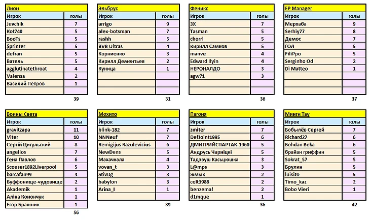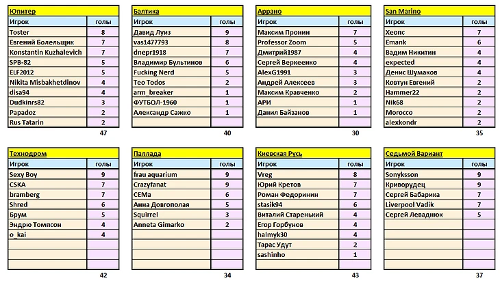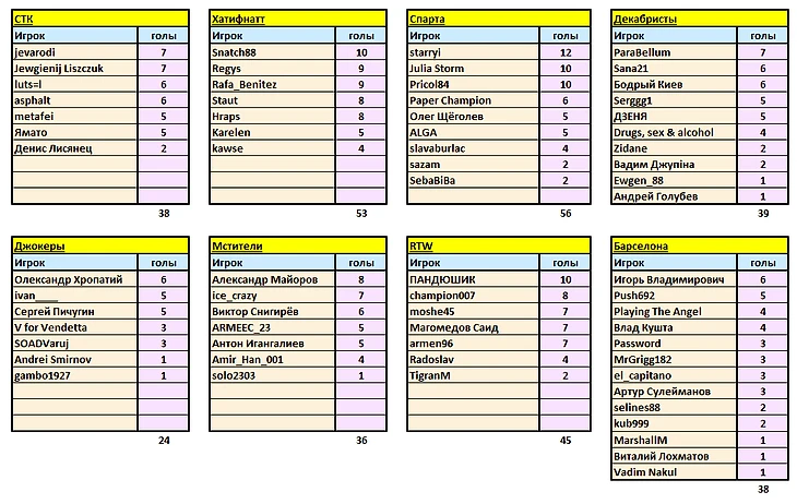 От командных достижении перейдём к личным, предлагаю вниманию таблички бомбардиров по всем командам за все 22 тура Клаусуры. Единоличным обладателем "золотой бутсы" стал starryi, забивший за Спарту 12 голов. На 1 "мяч" меньше в активе у gravitzap'ы из Воинов Света, знаковой отметки в 10 выигрышей на линии добились ещё 4 игрока: партнёры starryi'я по Спарте Julia Storm и Pricol84, представитель чемпионского Хатифнатта Snatch88, и ПАНДЮШИК из RTW. Во втором карьерном сезоне наколотить 10 голов - весьма значительный прогресс, тренировки у armen'a96 не пропадают даром :)