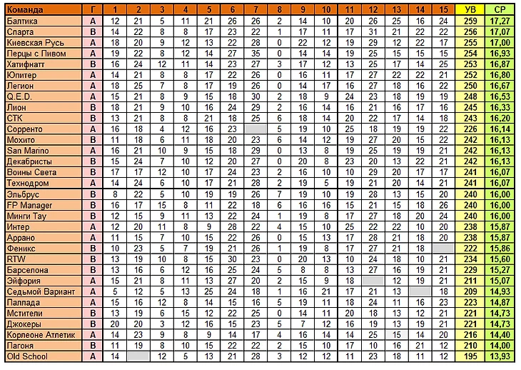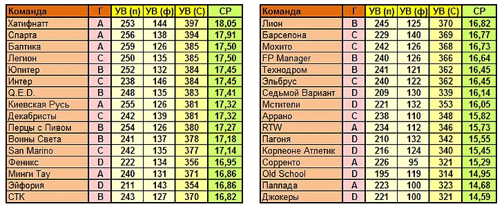 Но получилось несколько забавно: в сводной таблице УВ за весь чемпионат победитель и серебряный призёр заняли ведущие места, а бронзовый опередил только отправившихся в квалифай Джокеров. Джокеры, по словам их тренера, много УВ и очков теряли на последних минутах в МДП. Где-то случалось и такое, где-то "шуты" сами не дотягивали. Их товарищи по несчастью из Олд Скул недалеко ушли, финальный этап провели чуть лучше первого, но не достаточно, чтобы выиграть нужное число матчей для повышения рейтинга. Седьмой Вариант и в очных играх был сильнее, и на дистанции смотрелся привлекательне. Балтика, возглавлявшая данный рейтинг по окончании 1-го этапа, на втором показала средние цифры, но по сумме за 2 части сохранила место в 3-ке. Правда, очень близко подобрались Q.E.D., Интер, Юпитер, а Легион и вовсе разделил с "пивоварами" 3-4 места. Такой вот диссонанс, 22-ая команда чемпионата по угаданным варианта выдала 3-4 результат... Это в основном отголоски невезения на предварительном этапе, на финальном стоит учесть его специфику с делением на группы.