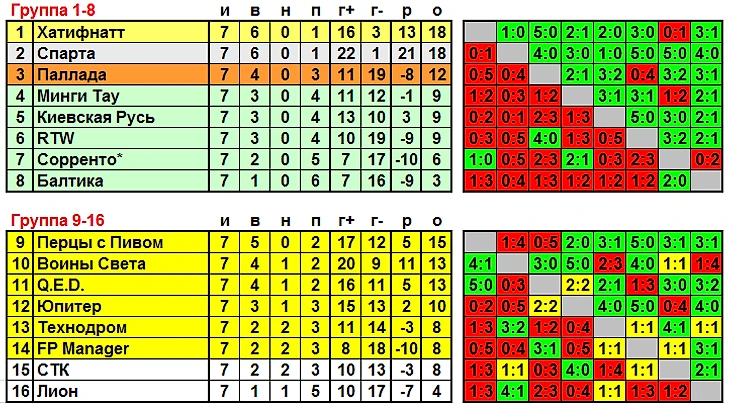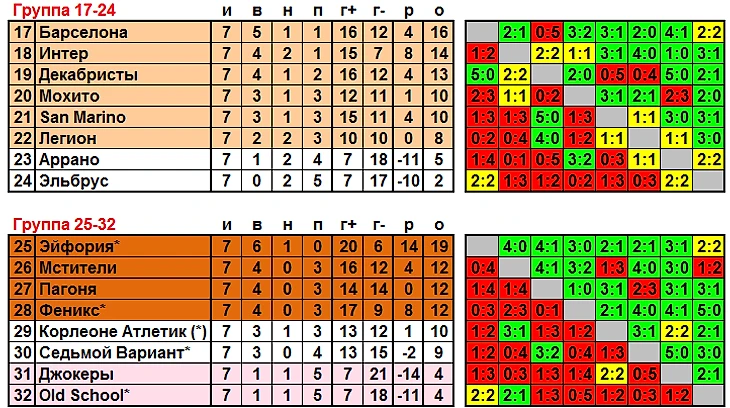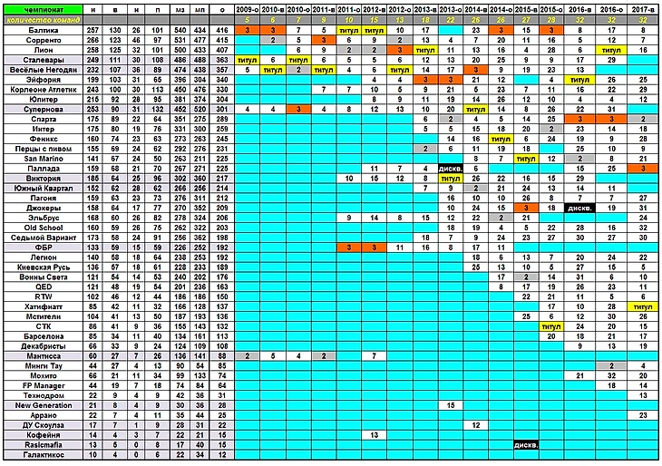 7 – сразу 7 команд заняли худшие места за время своего участия в чемпионатах: Олд Скул – 32-е, Корлеоне Ат. – 29-е, Феникс – 28-е, Пагоня – 27-е, Эльбрус – 24-е, Сан-Марино – 21-е, Декабристы – 19-е. Здесь же можно упомянуть Джокеров – 31-е, если не учитывать сезон, когда они были дисквалифицированы. Кроме того, С.Вариант повторил свой худший результат – 30-е место (у «седьмых» в последних 4-х сезонах весьма любопытный график – 27–30–27–30).