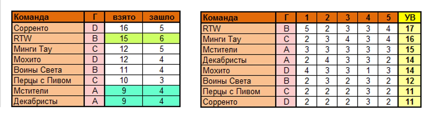 Во многом из-за данного манёвра они и проиграли матч Минги Тау, те серьёзно налегли на "11", на 3 линиях он у них был открыт; пренебрегли "соррентийцы" и вариант "29", тоже получили из-за этого 3 пробоины от подопечных Timo_kaz'a. Поймали "минги" на паре линий и ранний гол в виде "23", "итальянцы" ответили одним подобным ударом. В других парах, между прочим, "23" мелькнул лишь 1 раз, в прогнозе champion'a007. На одной строчке больше стоял у Минги вариант "15", на 3 в целом, Сорренто в равной степени использовало "15" и "14". А вот Мстители, видимо, вовсе не сомневались в "верхе", все дружно включили "15" и на 3 линиях, где он был свободным, подавили Воинов. Вот вам и 3:0 с перевесом в 1 УВ на каждой выигранной. Это, конечно, упрощённый расклад, применили ещё удачно Мстители фишку с "22", компенсировав недобор "29-ых". Всего 8 игроков из 40 активировали "22". Мохито сделали правильный выбор с результативностью, одолели Перцев, больше веривших в "14". Чуть более чёткий загруз на "15" помог и РТВшникам, при победе 2:1 важна любая деталь, и один из 4 "15-ых", ставший не перекрытым, укрепил преимущество armen'a96. Пропустили РТВшники "29", но ликвидировали пробел на карточках. Разделились они по "34" и "35", захватив на 2 линиях каждый, Декабристы в сильный "листопад" не верили. Вообще, "34" был куда популярнее "35-го", 28 человек включили средний карточный вариант, на более радикальный случай ориентировались лишь 5 игроков, кроме RTW, два представителя Сорренто (Mav1985 и StrangeR) и Richard27 из Минги Тау. Минимальное преимущество по картам не выручило "итальянцев", так же, как и единственная 9-ка в туре от Mav'a1985