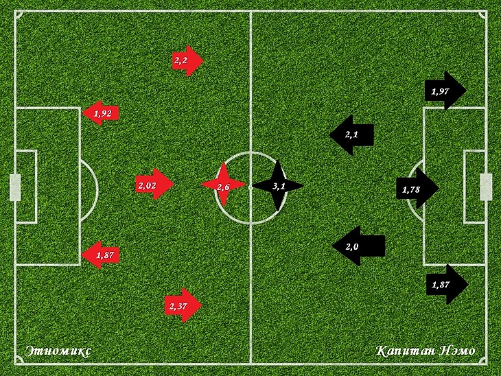 Александр Остапенко, капитан команды НЭМО, сплотив вокруг себя добротный коллектив, на игру с Микасами решил особо не суваться в атаку,и выставил всего одного напа, надо сказать что игра с одним нападающим очень популярна сейчас,другое дело для капитанвцев однозначно легкой прогулки сегодня не видать на другой стороне поля очень класные игроки, Тагир-финалист лиги и дважду участник плей офф, Анатолий-финалист лиги,Шамиль-финалист лиги. Этномикс на матч избрал снова не привычную тактику, как сообщает оффициальный источник у команды возникла проблема со связью с Шамилем и поэтому время на анализ не было, так что в совокупности особо радоваться не приходиться.