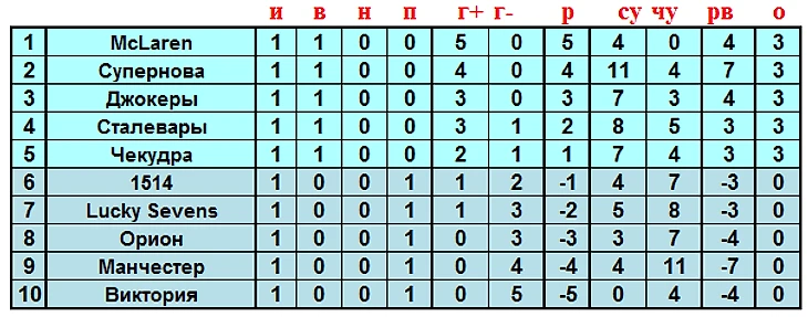 Напоминаю, по принципам "швейцарки" команды делятся на подгруппы согласно набранным очкам. По итогам 1-го тура образовались 2 подгруппы - 5 победителей с 3 баллами и 5 проигравших - с 0. Поскольку одна из групп (в данном случае, следовательно, и вторая) - нечётная, то производится сдвижка сверху вниз, т.е., последняя команда верхней группы (К5, Чекудра) присоединяется к нижней. Таким образом, получаем подгруппы с 4 и 6 командами. Внутри подгрупп команды распределяются так: К1 - К3 и К2 - К4 в верхней части; и К5 - К8, К6 - К9 и К7 - К10 в нижней.