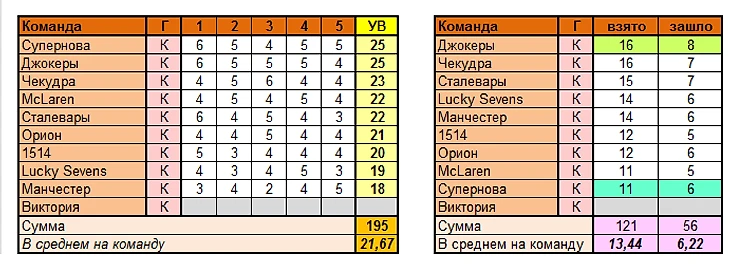 Лучшие команды тура по сумме УВ в целом: Супернова, Джокеры (по 25 вариантов)
