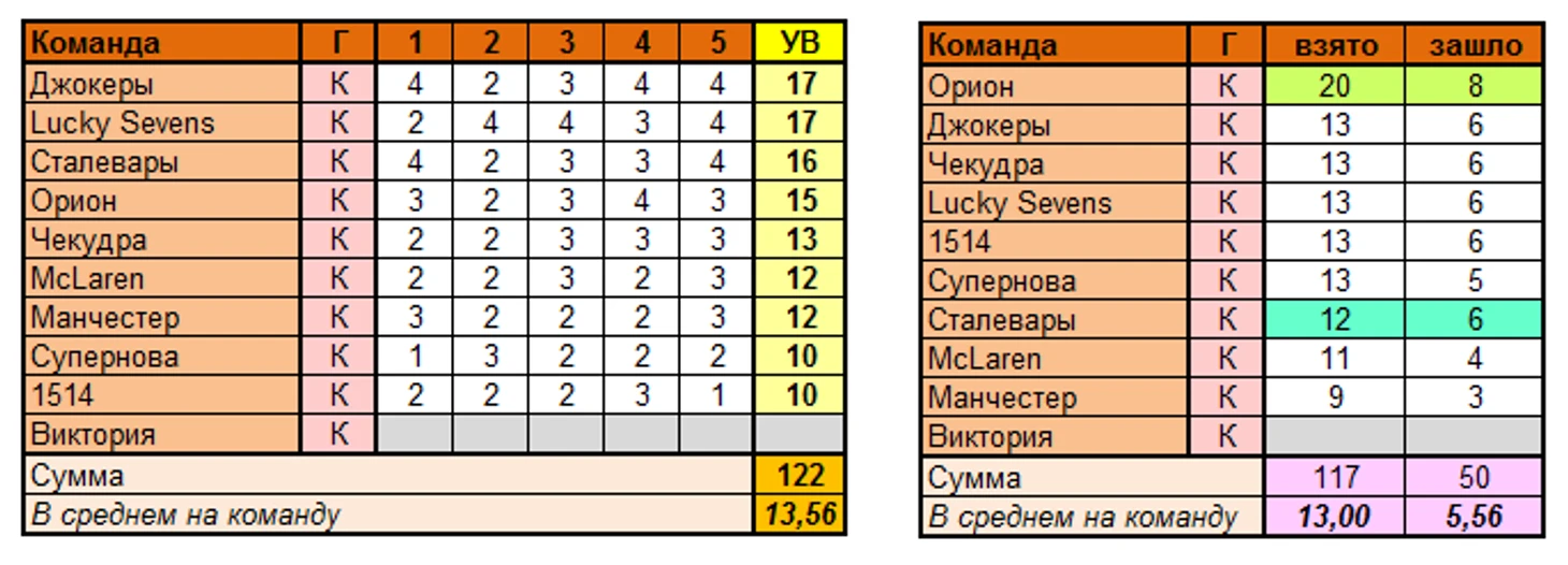 Лучшие команды тура по сумме УВ в целом: Джокеры, Lucky Sevens (по 17 вариантов)