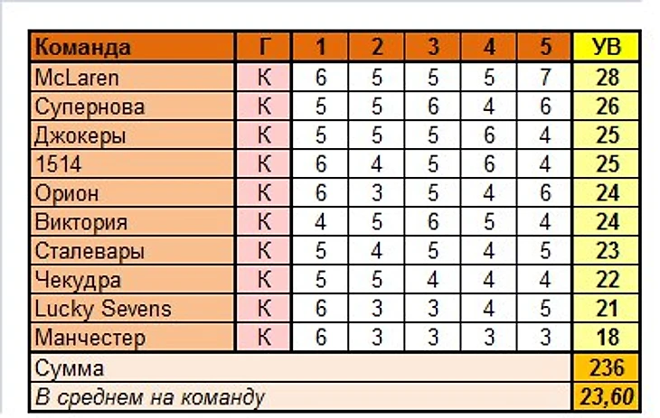 По сравнению с предыдущими турами квалификации, уровень УВ в этом туре просто зашкаливает. Впервые за турнир на одной из линий показалась "семёрка" УВ, автором перформанса стал дебютант McLaren'a - the_gifaffe, внёсший весомую лепту в итоговый успех команды по итогам тура и её первенство по сумме УВ ниже. Приличный уровень игры показали почти все коллективы, однако в негативную сторону выделеятся Манчестер, ошибка которых заключалась в недооценке ответственности тренера Виктории (хотя такое стоило ожидать и, думаю, многие бы сделали подобное на месте Виталия). Но возвратившиеся в игру "клубнички" сыграли на приличном уровне, не взяв ни секунды на раскачку, и прочно осели в середине таблички по сумме УВ. Игра на таком же уровне поможет команде хотя бы отчасти вернуть доброе имя к концу турнира.
