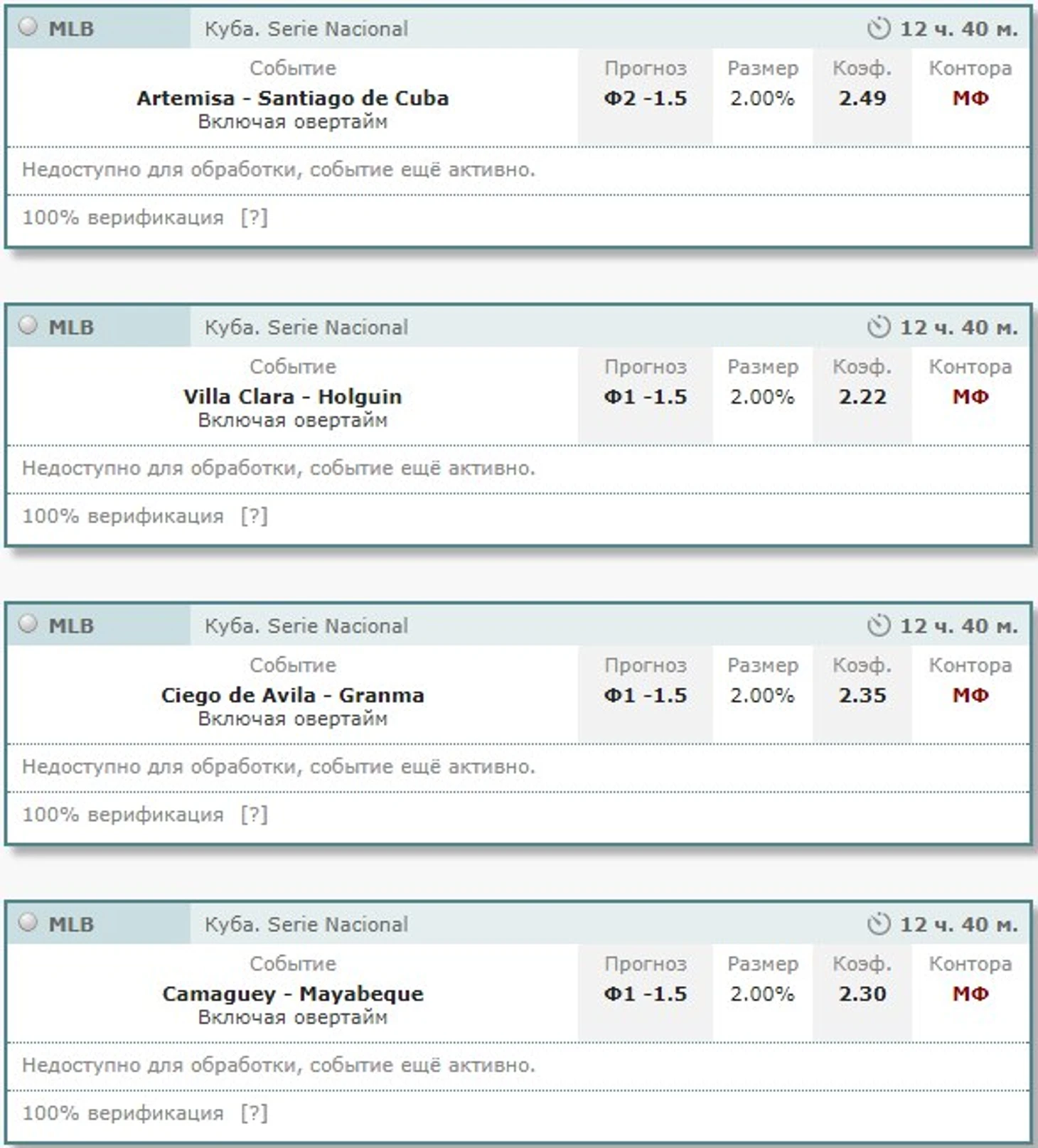 №22 21:00 Villa Clara - Holguin. Ф1 (-1.5) Коэфф 2.22 200 Марафон 1:2 ---