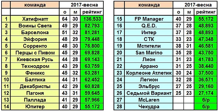 Юпитер располагается выше FP Manager, а Q.E.D. - выше Интера по лучшей разнице голов за весь весенний сезон