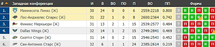 Я не думаю что Линкс отдадут 1 место, соперники у них там дальше не самые грозные, а у Спаркс еще будут тяжелые игры с тем же Коннектикутом что набрал серьезную форму. А у Линкс единственная возможность проиграть это Вашингтон дома в последнем туре, тот самый Вашингтон что в ужасной форме и без травмированной Хилл. Поэтому смело можно констатировать что Линкс 1 место не отдадут даже если проиграют сегодня.