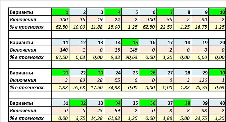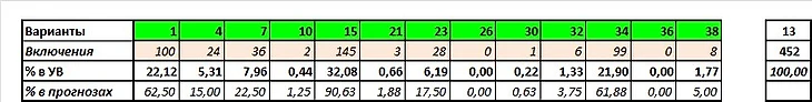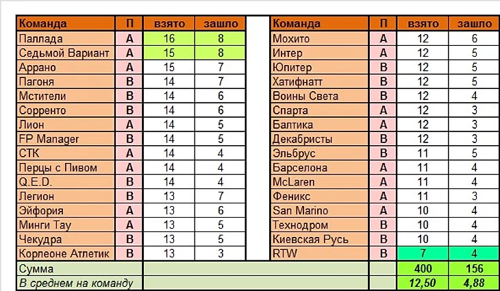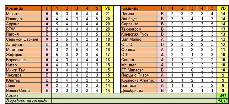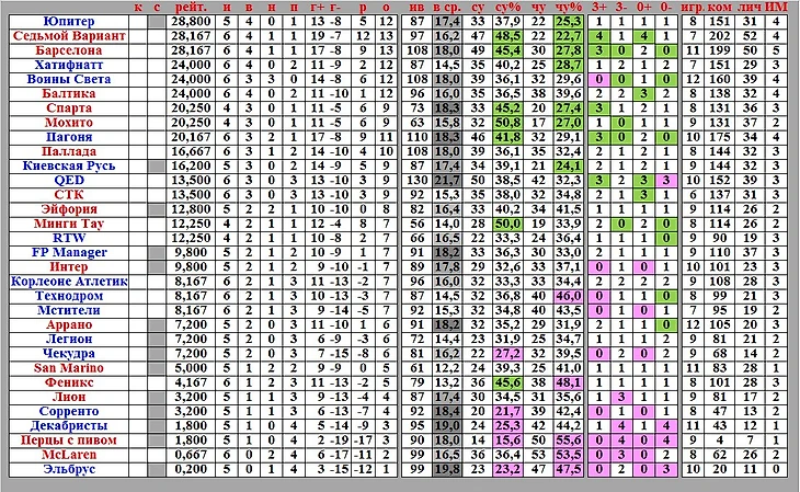 Следующие колонки – свои угаданные варианты всего (СУ) и их процент по отношению к игровым (СУ%), затем идут чужие угаданные всего (ЧУ) и опять же их процент (ЧУ%). Разумеется, нас интересуют прежде всего процентные показатели. Лучшие из них выделены зелёным цветом, худшие – розовым. Нетрудно догадаться, что если у команды в этом блоке наличествуют две зелёные ячейки, то у нее всё в порядке как с собственным угадыванием, так и с тем, что плохо угадывают их соперники. Ну а если две розовые – всё плохо. И опять же знакомые всё лица: среди фаворитов у нас опять же Седьмой Вариант и Барселона, а также Спарта и Мохито (ну и у Пагони с Хатифнаттом дела обстоят очень неплохо), среди аутсайдеров – Эльбрус и Перцы с пивом. Особенно у последних показатели просто катастрофические.