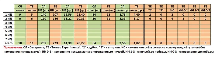 Особое внимание в таблице – к ее правой части, где в отдельных колонках добавлена важная информация именно по ТЕ и именно в связи с новыми правилами. Как видите, пока обходится без хет-триков, но дублей во 2-м туре получилось в три раза больше, и их общее число достигло уже 8. Это изменило счёт более чем в половине проведенных матчей (в 6 из 11-ти). А главная новость – впервые изменился не просто счёт, а исход матча: дубль одного из «республиканцев» позволил его команде с поражения убежать на ничью, 2:3 во встрече SanMarino– 1514 поменялось на 3:3.