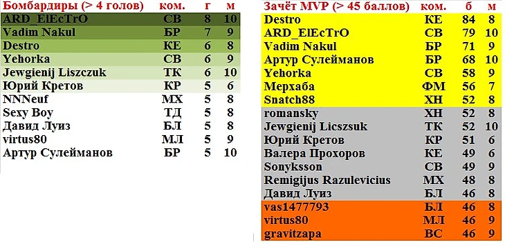 Прочую интересную информацию для себя каждый легко найдёт в таблице и сам. Благо что все пояснения отныне под рукой (точнее, под самой таблицей). А я заключаю этот коротенький обзор текущими списками лучших бомбардиров сезона и претендентов на звание лучшего игрока.