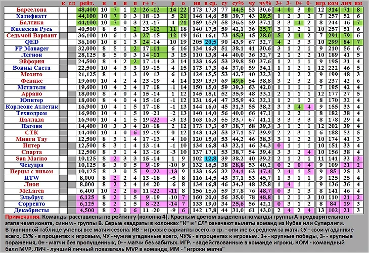 Хуже всех, прокатившись на двух нулях, выступили на этом отрезке СТК, Паллада и Корлеоне Атлетик. Никак не преодолеют кризис Пагоня, RTW (по 1 очку в четырёх крайних ИД) и Спарта (1 очко уже в пяти матчах). Почти все они (кроме КА), что закономерно, сползли в нижнюю половину таблицы. И обратите внимание, что в верхней теперь преобладает синий цвет представителей из группы В чемпионата. Перевес небольшой – 9 против 7 – но совсем недавно было наоборот. И это как бы очередной намёк, что в 7-40 решает не крутизна имён и титулов (их в группе А собралось на порядок больше!*), а исключительно игра.