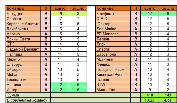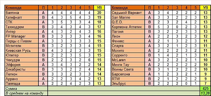 Лучшая команда тура по сумме УВ в целом: Балтика (20 вариантов)