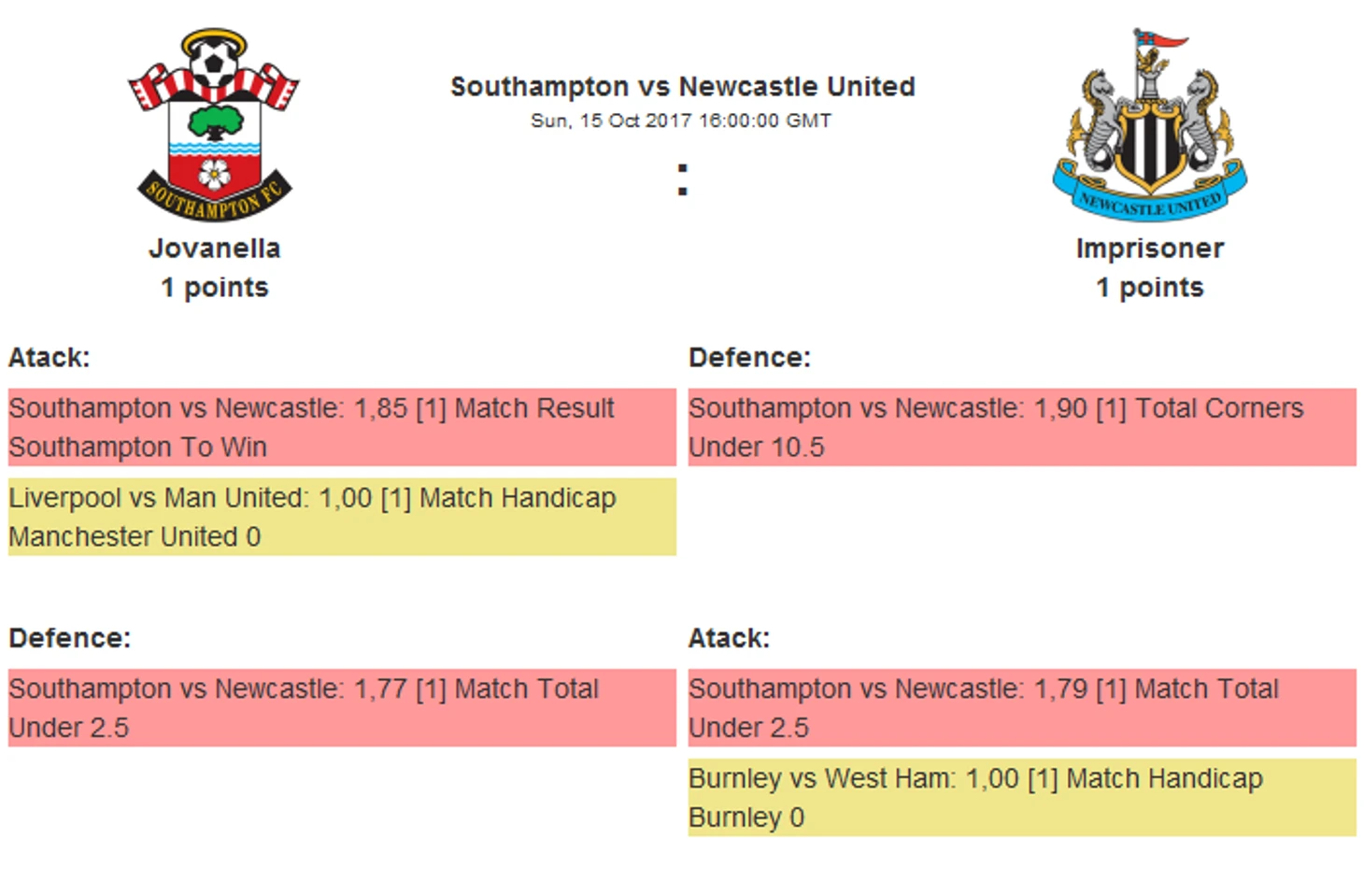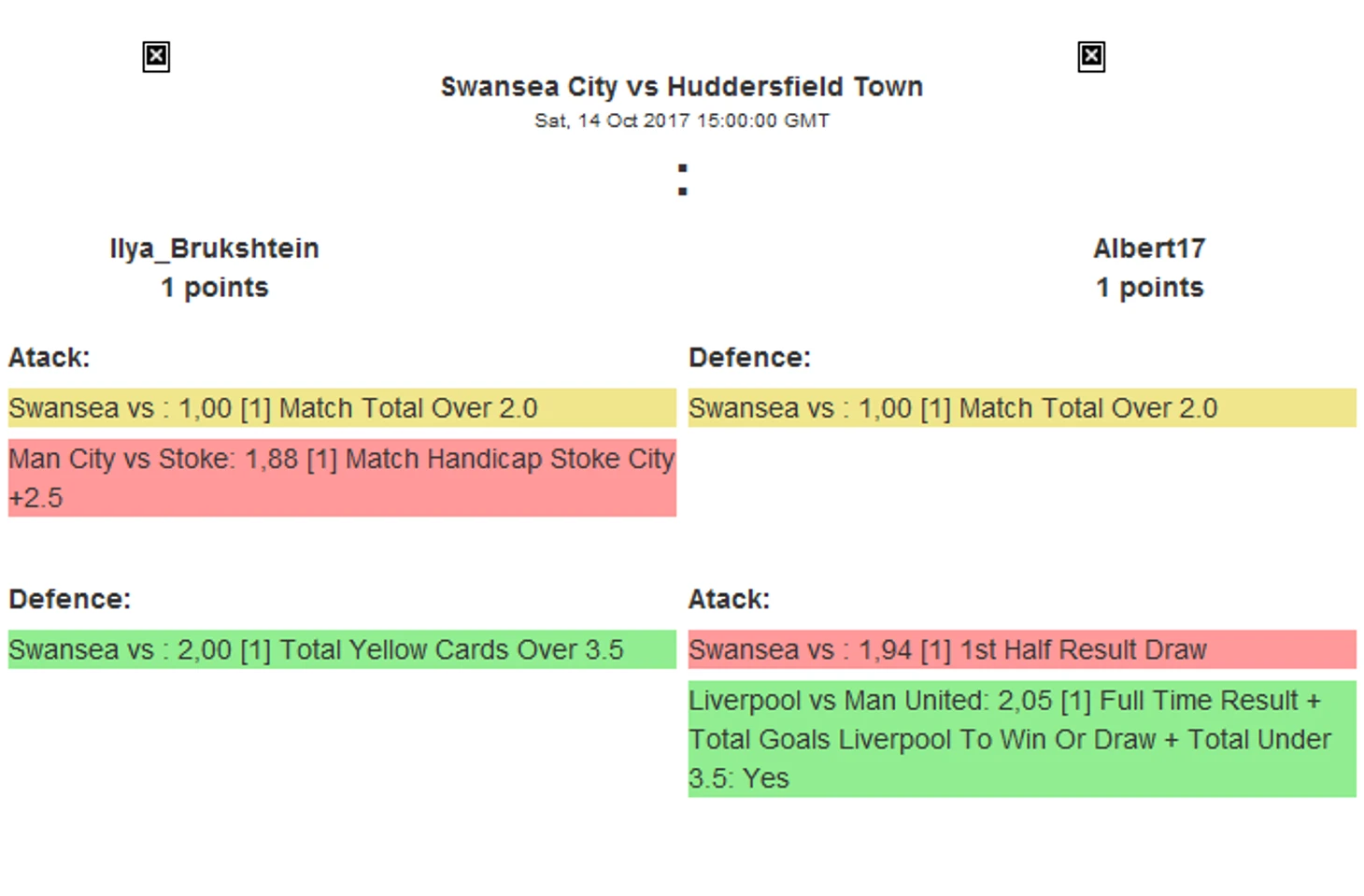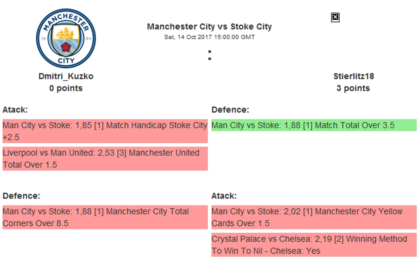 Прекрасный матч прошел между Stierlitz18 и Jovanella, Стоукмэн затащил 3 прогноза с привычными коэфами меньше двойки, ну а батюшка думал не просто выиграть, а прилично подрасхерачить позиции опонента путем выбора событий с коэфами за 2, в итоге зашли всего два ценой в 2.01 и 2.20, ну а самый оптимистичный прогноз в 2.39 в итоге подвел. Какая мораль ? Да хоть какая, например не надо жадничать, ну или не везет тому кто везет (напомню Jovanella на третьем месте...), ну или хотя бы в АПЛ фаворитов нет, ведь Stierlitz18 затащил будучи на предпоследнем месте.