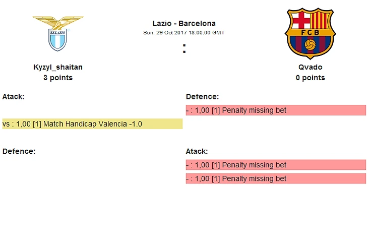 Шайтан прет на всех порах к золоту. он на данный момент самый реальный контендер. Я думаю он даже не смотрит на своего соперника, шутка ли, он не знает горечи проигранных ставок уже 8 ставок подряд, а последние 6 ставок зашли. Вот уж тяга к победе, всем нам учится у него. Да и в целом по турниру Шайтан конечно заслуживает короны, его стата+13 =5 -3. Подумайте только, он не занес только 3 ставки из 21 сделанного прогноза. Qvado уже не играет два матча подряд, хотя если б он их выиграл, то сейчас имел бы 13 очков и фактически был бы тоже в списке претендентов на призовую тройку... Ну может хоть отнять очки у главного претендента возбудят Qvado сыграть в этом туре ?