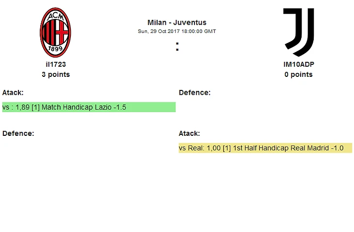 Самый интересный матч тура как в футболе так и у нас в ставках пройдет в Милане, il1723 так же как и Шайтан в прекрасной форме, 9 заходов в последних 12 ставках, но играть сегодня с IM10ADP, откровенно говоря Имам провел провальный турнир, команда которую он знает до мозга костей не принесла ему удачи в ставках, тем не менее это не делает его очень опасным соперником когда дело касается ставок на Юве. Ну вот подумайте сами, решите ставить на Юве, у кого спросите совета ? правильно. у Имама !