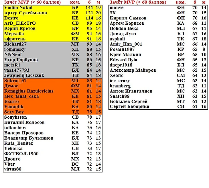 У нашего лидера в зачете MVP (Vadim Nakul): в команде +14=2-3, лично +13=4-3, ув 37-22 из 70 и 2ИМ. Итог: 42+2+39+4+37+15+2=141.
