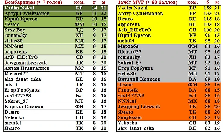 Так же как и Барселона, двумя победами за неделю отметились Спарта (разность голов 7-1; при этом ее игроки Олег Щеголев и недавний дебютант antonuv забивают уже в четырех матчах кряду), McLaren (6-0) и RTW (7-0). «Ротвейлеры» сейчас тянут прекрасную победную серию из 5-ти матчей и беспроигрышную из 6-ти. Ряд команд ограничился всего одной победой, но они не участвовали в суперлиговом туре.