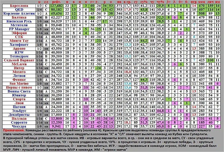 Как видите, Барселона в таблице «вся покрыта зеленью, абсолютно вся». Хотя нет, не абсолютно, пока что она не не угодила в компанию лучших по своим угаданным вариантам и по пропущенным голам, но близка к тому и другому. Компанию Барселоне в чемпионате составила Эйфория, а в Суперлиге – действующие обладатели этого трофея Минги Тау. Причем «тау-китяне» досрочно гарантировали себе первое место в своей группе и поступили очень благоразумно, так как по сетке плей-офф могут пересечься с Барселоной разве что в финале.