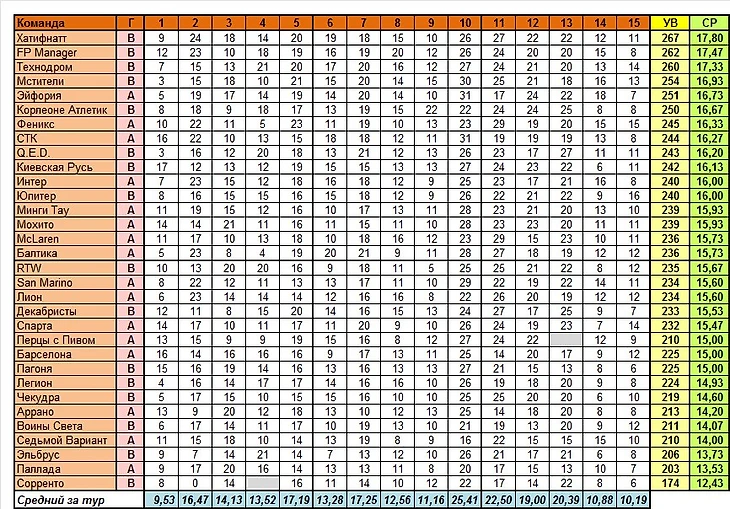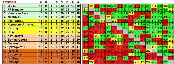 Группа В тоже имела немало интриг к последнему туру, в борьбе за места в топ-4 ключевыми были матчи Киевская Русь – Сорренто и Корлеоне Атлетик – Мстители. «Русичи» сохранили концентрацию и победили одного из аутсайдеров, а Мстители, находясь в положении догоняющих, обыграли «мафию» (в обоих матчах здесь сыграла большую роль «9») и после годичного прозябания в 25-32 заработали шанс побороться за более высокие позиции, аж за медали царапаться будут. Со времён тренерства Стаса «мстители» не забирались в чемпионскую группу. Корлеоне опустился в следующую по статусу, попутно пропустив на 5-ую строчку Технодром. Повлияет это только на график игр финального этапа, впрочем, вполне допускаю, что крупная победа над лидером (к 15-му туру) группы В, FP Manager, приободрит Технодром на успех в новой стадии... Юпитер отстоял место место в первой половине, уже 6-ой чемпионат кряду "инопланетяне" будут завершать в одной из двух верхних групп фин. этапа. А действующий чемпион, Хатифнатт, неожиданно для многих, вылетел из второй 4-ки группы в 3-ю. Поражение в жёсткой схватке от RTW (и снова решил исход больший упор на 3-9 от победителей), выигрыши Технодрома и Юпитера, и "хатти" уже 9-ые, в зубодробительном составе фин. группы 17-24. Обращал я внимание в нарезочке, что ничья с Сорренто может помешать им пробиться в топ-4, а тут и в 5-8 не удержались в плотной борьбе. Правда, конечно, можно найти недобор в каком-либо другом матче, невыигранным Хатифнаттом. Но Сорренто прям неудобным соперником для него становится, единственное поражение именно оно нанесло в финальном этапе весеннего сезона. Сейчас соррентийцы были очень далеки от борьбы за топ-4, и по игре, и по результатам. Эльбрус и Чекудра тоже подходили к последнему туру без шансов на выход из нижней зоны, слишком много туров проиграли... Чекудра в личной встрече одержала лишь 2-ую для себя победу в чемпионате. Только Пагоня могла прорвать границу двух зон, но мало угадала в 15-ом туре и крупно проиграла Юпитеру. Декабристы отделались лёгким испугом после проигрыша Воинам Света. Но теперь в группе 17-24 нужно будет серьёзно попотеть, чтоб пробиться на весну в Суперлигу, а для "реформаторов" актуальна и проблема рейтинга, запас небольшой на данный момент...