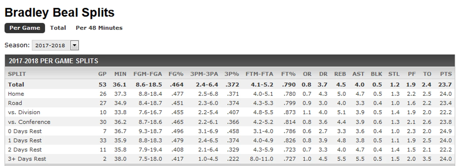 Давайте обратимся к продвинутой статистике, благо в НБА ее очень много, и увидим, что лидер "Вашингтона" (в связи с отсутствием Джона Уолла) Брэдли Бил на протяжении этого сезона свой лучший баскетбол показывает именно в играх, когда его команда играть 2 дня подряд.