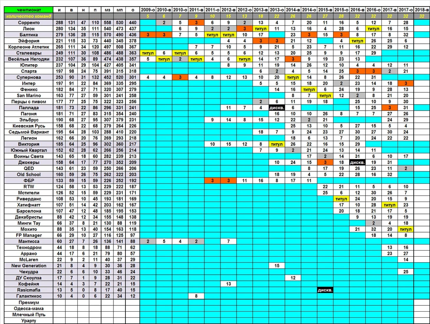 Накануне старта 18-го чемпионата в истории игры на рублогах/спортса публикую сводную таблицу с данными за предыдущие 17 первенств. По злой иронии вышедшее в лидеры по очкам по итогам Апертуры-2017 Сорренто не сможет остоять верхнюю строчку, поскольку не прошло январский отборочный турнира. Не примет в наступающем чемпионате и прежний лидер, Балтика, команда в конце прошлого сезона приняла решение взять паузу. А это значит, что вскоре новый очковый максимум будет установлен Лионом, и обоснуется он на первой позиции надолго. Следующая из действующих команд, Эйфория, уступает 59 баллов.