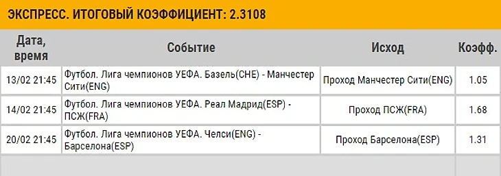 Буду краток: Пари Сен-Жермен, Барселона и Манчестер Сити являются главными фаворитами Лиги чемпионов в нынешнем сезоне. Именно эти клубы разыграют между собой победу в главном клубном турнире. Поэтому, я считаю, что у их соперников по стадии 1/8 финала нет никаких шансов.
