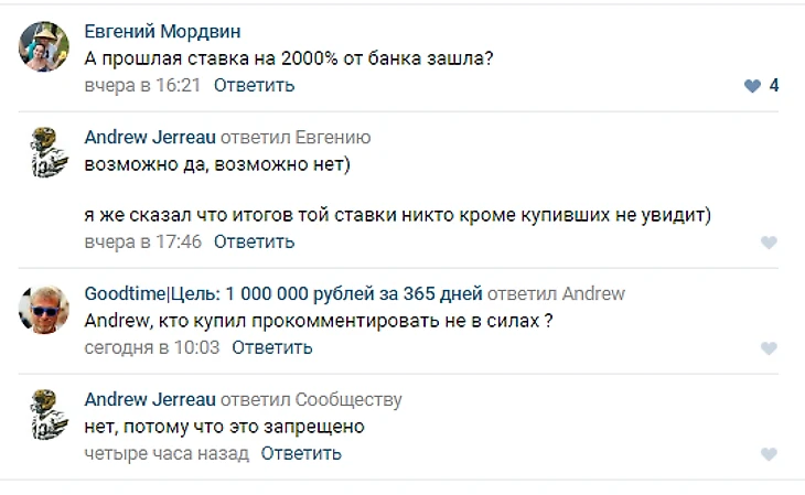 PS2 Кроме вчерашней минусовой "очень уверенной ставки на миллион" у него в паблике был анонс такой же "ставки на миллион" несколько недель назад, но в тех пор о ней тишина и вот что вчера я увидел в комментах ВК