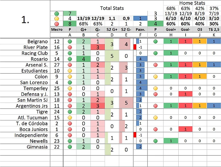 С.: Рано делать выводы. Давай смотреть дальше. Самое интересное начинается со столбца "G". Тут статистика только по домашним матчам "Банфилда". Если строка пустая, значит играли на выезде. "G" - исходы,