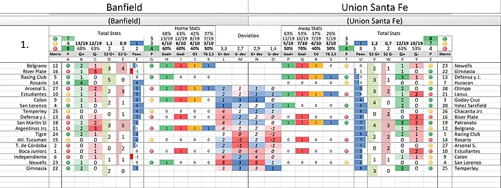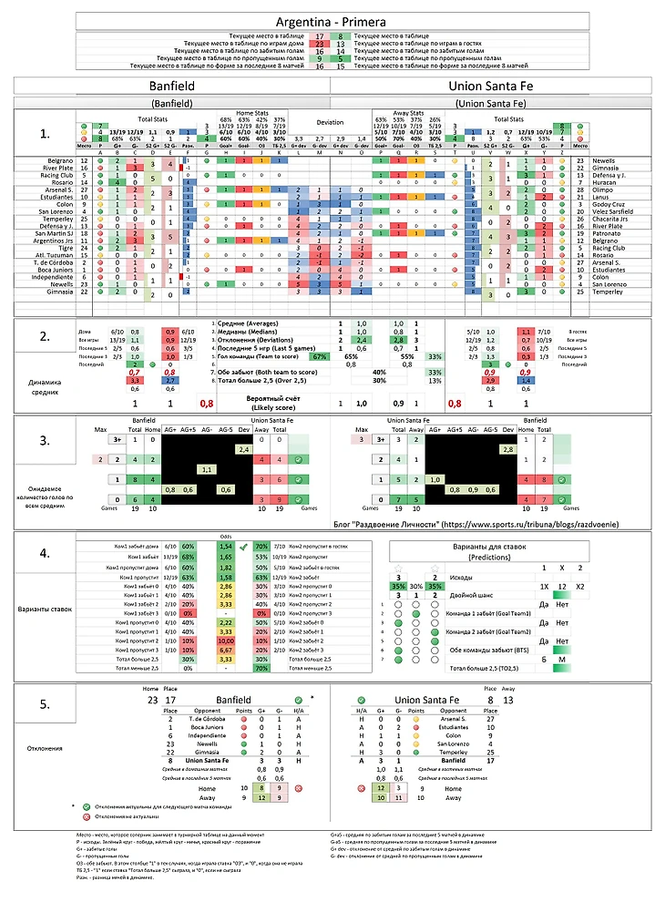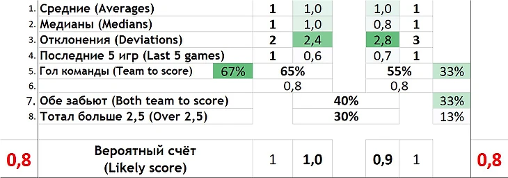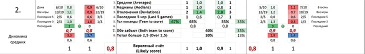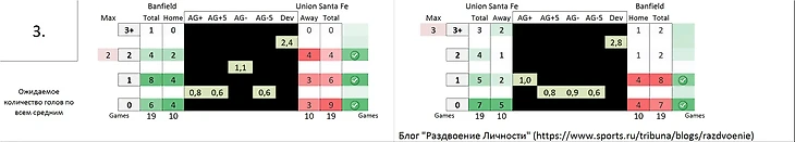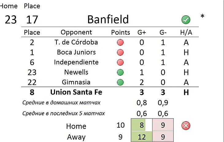 С.: Для этого я предлагаю посмотреть все параметры вместев части по центру: средние, медианы, средние в последних 5 матчах и особенно домашние и гостевые средние. Если «Банфилд» забивает на своём поле 0,8 гола за игру, а «Юнион» в гостях пропускает 1,1 я буду считать, что это общее значение для них будет 1. На этом можно построить прогноз по каждой из средних. А в итоге, получится некий счёт, одинаково подходящий под все показатели.