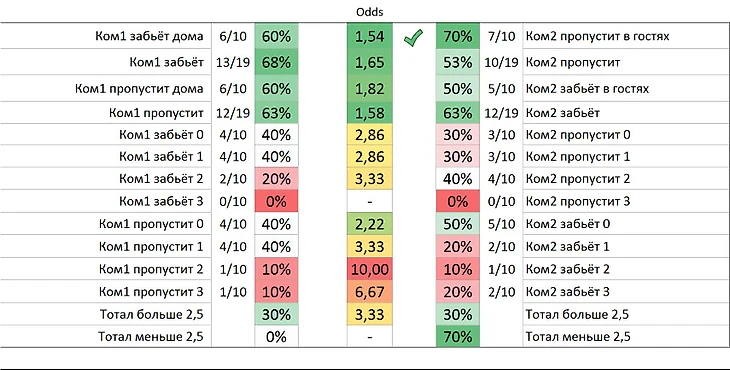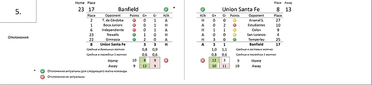 Чтобы считать отклонения, нужно чтобы 2 из 5 последних матчей первой команды были домашними. Тогда следующий будет третьим и закроет незаконченный двухматчевый цикл. А у гостевой команды наоборот - 2 игры из 5 должны быть гостевыми.