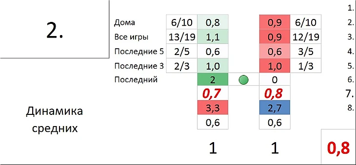Идея в следующем. Для того, чтобы понять, как сыграет команда свой следующий матч, нужно понять, в какой точке она сейчас находится. В этом, по сути, и есть наша с тобой главная задача. Для этого так много разных параметров. Мы должны оценить их все одновременно, и понять, куда движется команда. На этом принципе построен второй блок. Мы идём от общего к частному. Ты видишь два столбца из цифр: первый - забитые голы, второй - пропущенные.