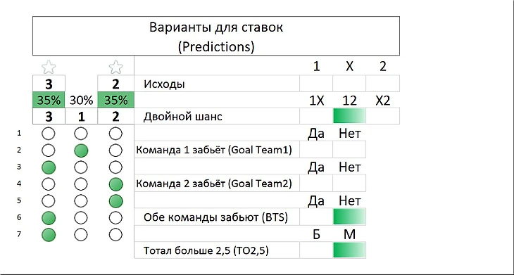 В левой части сверху вниз перечислены все события, по которым можно посчитать вероятности. Из этих вероятностей считается справедливый коэффициент на конкретное событие. Галочка появляется напротив самого вероятного.