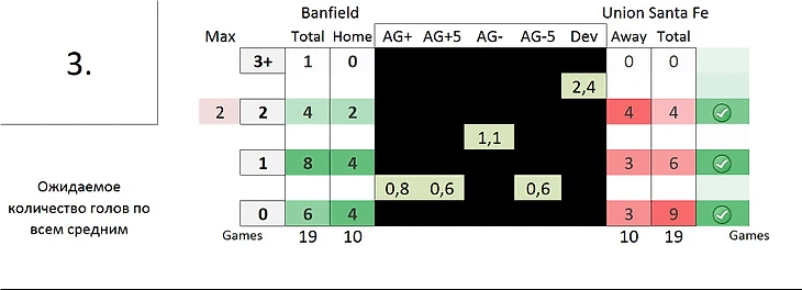 В самом последнем столбце галочкой выделяются уровни, на которых больше всего голов. То есть конкретно по "Банфилду" может быть от 0 до 2 голов, но больше всего средних оказалось между "0" и "1".
