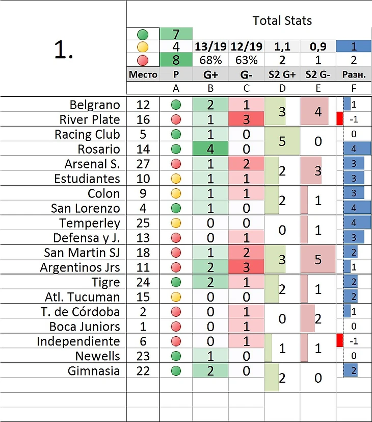 С.: Это разница мячей. Только в динамике. В этих колонках ты можешь увидеть, как меняется разница мячей каждой из команд. "Банфилд" выиграл свой первый матч в сезоне со счётом 2:1. Разница мячей +1. Второй матч проиграли 1:3 - разница -2. К +1 после первого матча прибавляем -2, получается -1. И так далее. В "шапке" над названием нижнее число - это разница мячей после всех матчей, а верхнее число - это изменение только за последние 5.