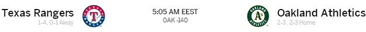 Вишенкой на тортике вчерашнего игрового дня стала победа с форой -1.5 Oakland Athletics, которые одолели, ужасно стартовавших в новом сезоне, Texas Rangers. Гости решили выставить стартовым питчером "ветерана космических войск" B. Colon, который, кстати, за 6 иннингов пропустил всего 1 ран (и тот оказался хоумранов в исполнении M. Chapman). Стоит отметить уверенную игру реливеров Athletics, а именно B. Treinen (ему доверили место на горке в тот момент, когда все базы ему команды были забиты бейсболистами Rangers), который умудрился организовать один "страйкаут" в опаснейший момент для своей команды. Хладнокровный. Нельзя пройти мимо основного питчера на сегодняшний матч от Oakland Athletics - A. Triggs, который провел уверенно выделенные ему 5 иннингов и совершил 7 "страйкаутов".