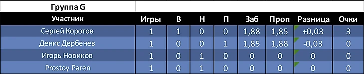 Prostoy Paren получил 0 очков, тк ставка не сыграла. Разница забитых и пропущенных 0.
