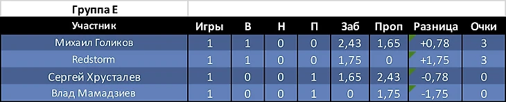 Сергей получил 0 очков, хотя его ставка сыграла, тк коэф соперника выше. Разница забитых и пропущенных -0,78.