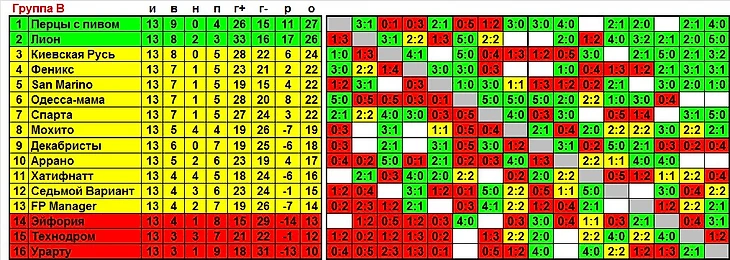 Здесь места в финальной пульке гарантировали себе только Перцы и Лион (помните этот удивительный исход чемпионата с их участием весной 2013 года? Команда (Перцы, а тогда еще Чупссы), практически гарантированно становилась чемпионом, но на последний тур «забыла» прислать заявку…). Но руководствуясь здравым смыслом и всеми давними традициями игры 7-40, можно с определённой степенью уверенности говорить, что из группы В в финал 1-16 попадут первые семь команд. Эйфория же никак туда не пройдёт из-за негативной личной встречи с Мохито.