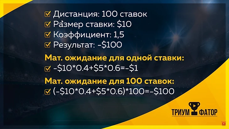 Я очень часто наталкивался на форумах даже на такие абсурдные фразы как например: «Думаю Челси выиграет этот матч в 60% случаев поэтому поставлю на них за коэффициент 1,5». То есть автору этой фразы достаточно того, что его ставка сыграет чаще, чем не сыграет, и совершенно наплевать, что если его ставка будет играть в 60% случаев при коэффициенте 1,5, то он будет терять на дистанции 10% от поставленных денег. А значит, если он поставит 100 ставок по $10 на коэффициент 1,5, то в среднем на дистанции он проиграет за эти 100 ставок $100. Здесь достаточно легкий расчет, но я все же остановлюсь на нем чтобы ни у кого не возникало вопросов. Игрок ставит $10 на одну ставку. Выиграет он ее в 60% случаев, а проиграет соответственно в 40% случаев. Значит в 40% случаев он получит убыток в 10$, а в 60% случаев его прибыль составит $5, так как он ставил $10 за коэффициент 1,5. А значит на длинной дистанции он будет терять в среднем по одному доллару с каждой ставки. Формула всех расчетов на скрине.
