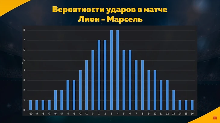 Тоже самое Пауль сделал и для ударов по воротам, к примеру на картинке ниже в 8% случаев Лион нанесет ровно на 4 удара больше, чем соперник, и так же в 8% матчей ровно на 3 удара больше, чем соперник. В 1 % матчей на 16 ударов больше, чем соперник, и так же в 1% на 10 ударов меньше, чем соперник.