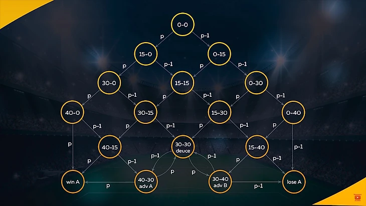 Первое что приходит на ум это геймы, но и с ними есть множество проблем. Количество геймов, которые играет игрок, по-прежнему недостаточно большое, особенно если вспомнить что теннис это одиночный вид спорта и здесь очень большое влияние на вероятности играет текущая форма игрока, поэтому модели нужно строить на свежих данных, т. к. модели которые построены на данных четырех-пяти месячной давности будут очень неточны из-за того, что форма игроков в то время была совершенно другая относительно нынешней формы. Еще одной проблемой является то, что геймы в теннисе набираются не всегда линейным способом, ведь никак нельзя сыграть ровно 11 геймов в сете, это вносит очень большие коррективы при прогнозировании тотала. Об этом мы обязательно расскажем в дальнейших наших постах и видео. В общем мы подошли к ответу, что точнее всего вероятности исходов в теннисном матче прогнозируются с помощью данных о вероятности выиграть один розыгрыш. Зная вероятности с которыми соперники будут выигрывать очко на своей подаче против конкретного соперника, можно очень легко с помощью метода Монте-Карло посчитать абсолютно любую вероятность в матче, от вероятности побед соперников, до вероятностей того, что конечный счет будет 7-6 2-6 1-6.