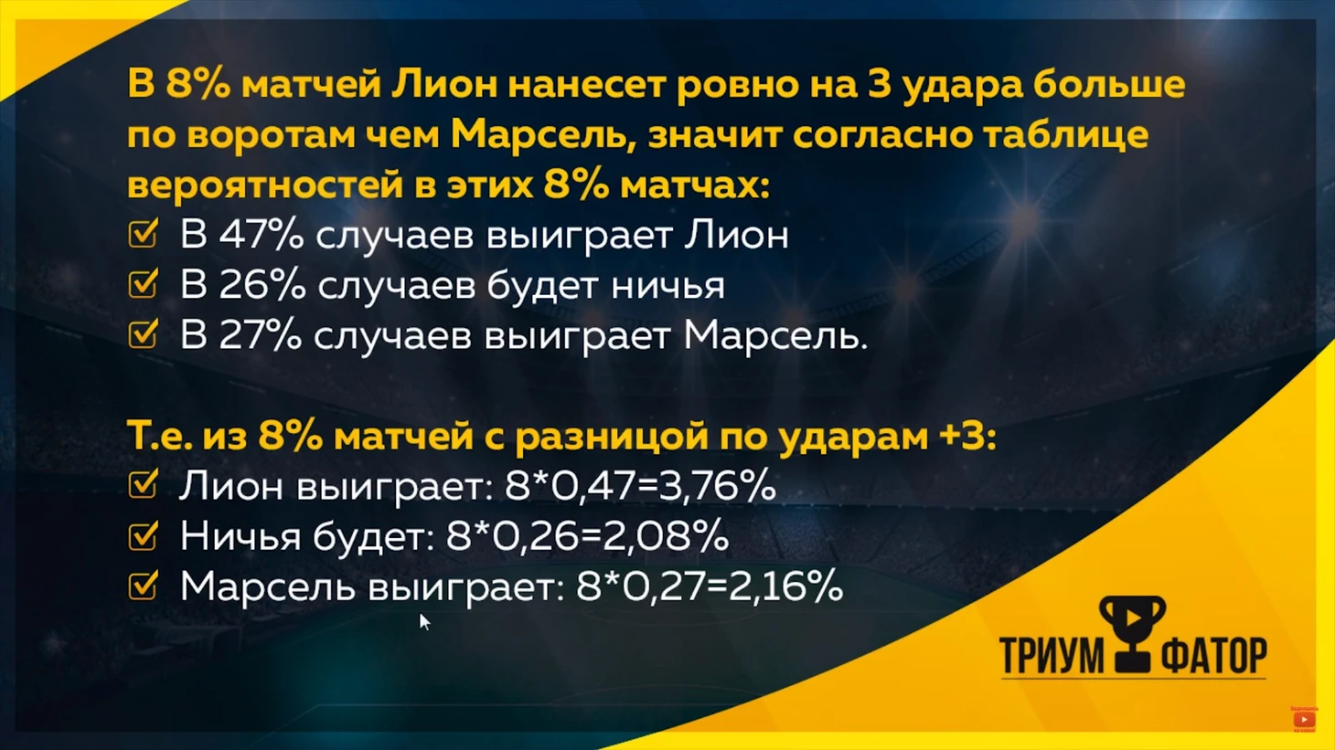То есть из этих 8% матчей Лион выиграет 8*0,47=3,76%, ничья будет в 8*0,26=2,08%, а Марсель победит в 8*0,27=2,16%.