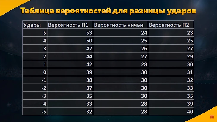 Вторая колонка - это вероятность с которой выиграет первая команда при той или иной разнице в ударах.