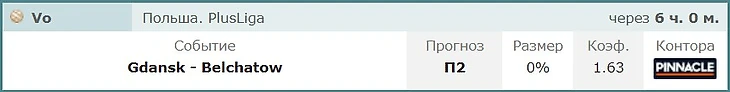 На мой субъективный взгляд состав Белхатова позачетней и глубже. Тот же Пенчев может усилить игру со скамейки, а кто усилит со скамейки Гданьск? У Гданьска вон Мика в прошлой игре 21% позитивного приема показал, а Мика и хороший прием это слова синонимы
