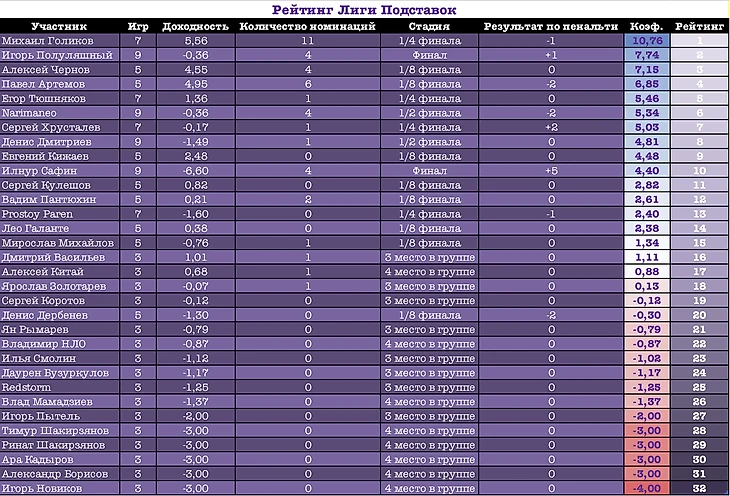 Данный рейтинг в отличии от остальных не является чисто математическим. В его основе лежат также: узнаваемость участника, его признание и достижения. Однако он несет в себе и более информативную функцию в части доходности каждого участика. В общем, предлагаем начать знакомство с рейтингом Лиги Подставок: