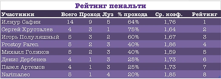 Все по аналогии с предыдушим рейтингом. Единственное отличие от рейтинга проходов заключается в том, что в рейтинге пенальти выше оказывается участник, который дал больше проходов. При равенстве проходов и лузов выше оказывается тот, у кого больше средний коэффциент.
