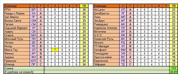 Лучшая команда тура по сумме УВ в целом: RTW (30 вариантов)