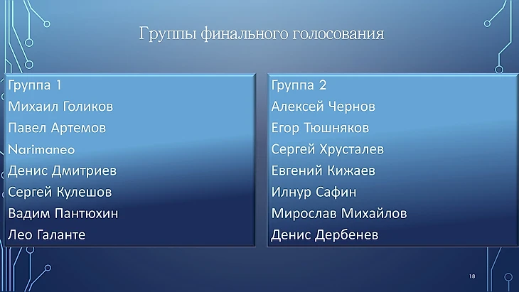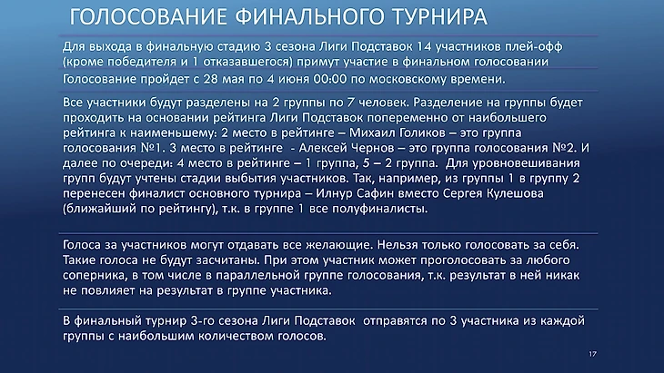 С 28 мая по 4 июня 00:00 по Мск в нашей группе ВК пройдет финальное голосование за 6 путевок на ЧМ-2018 среди 14 участников плей-офф основного турнира. От участии в голосовании отказался Prostoy Paren, в связи с этим все 6 счастливчиков определятся именно в голосовании. Отдельно выбирать человека, кто пройдет в финальный турнир без голосования мы не будем.