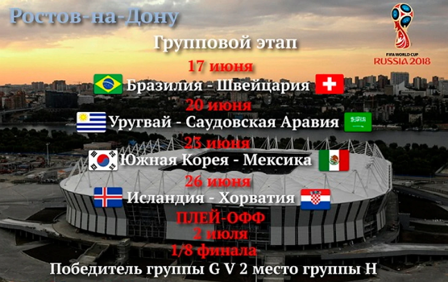 Футбольные матчи состоятся на стадионе «Ростов-Арена». Он расположен на левом берегу Дона, неподалеку от Гребного канала. Грунт, где возводился спортивный комплекс, очень сложный, из-за непосредственной близости реки и склонности к подтоплениям. Для строительства пришлось создать специальный намывной слой песка, высотой в 6 метров.